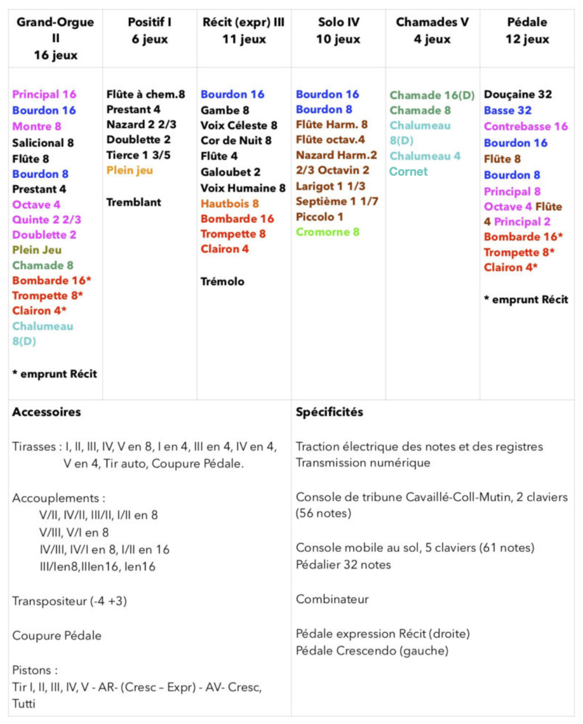 Le projet définitivement adopté propose une répartition des timbres (62 jeux) sur 6 plans sonores (5 claviers manuels et 1 pédalier) avec de nombreux jeux de détails (flûte, Galoubet, Cromorne, Violoncelle, Trompette, Clairon, Hautbois, Cornet etc…) permettant l’interprétation d’un vaste répertoire couvrant plusieurs époques.